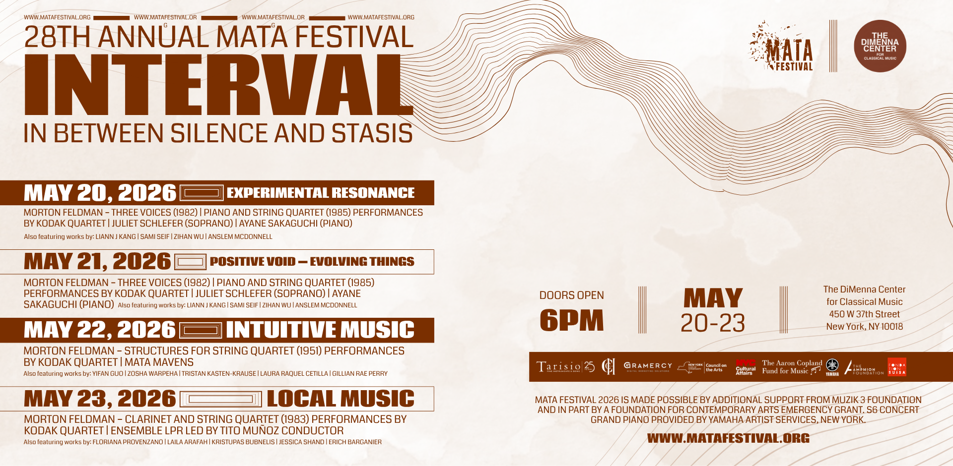 The 28th annual MATA Festival of New Music takes place May 21 - 23, with three concerts at the DiMenna Center in New York City. Hailed by The New Yorker as “the most exciting showcase for outstanding young composers from around the world,” the 2026 Festival draws on the ever-expanding artistic legacy of composer Morton Feldman, whose 100th anniversary is celebrated this year. Festival Passes are available through Eventbrite [LINK].
