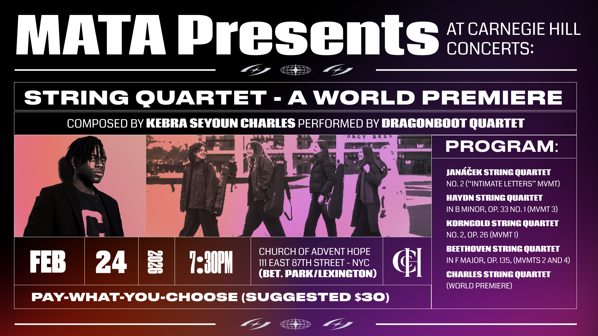 MATA Presents at Carnegie Hill Concerts: “STRING QUARTET” - A World Premiere composed by Kebra Seyoun Charles performed by DragonBoot Quartet